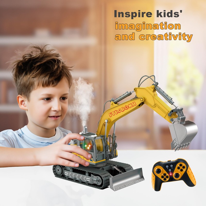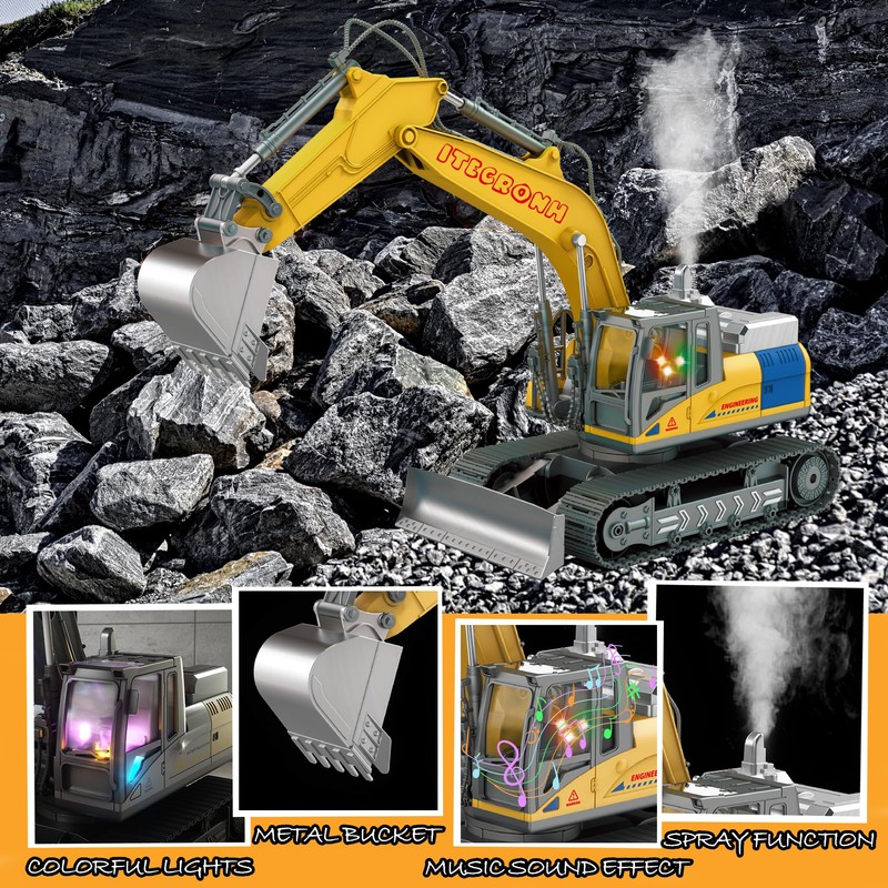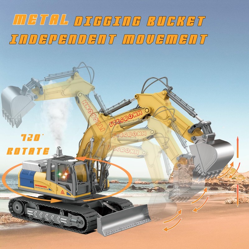 - - **Realistic Features for Engaging Play:** The excavator is equipped with a 720-degree rotating digging arm, simulated alloy shovel, and hydraulic arm, along with realistic smoke, sound, lighting, and an authentic cab design to provide an immersive construction experience