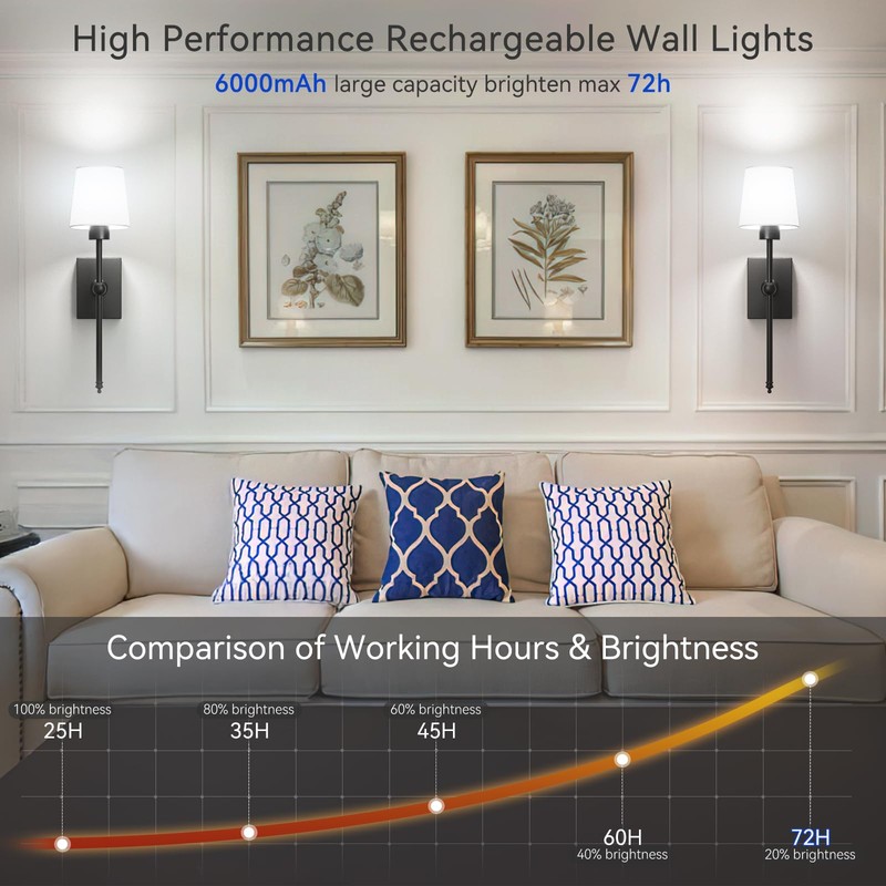 - 【6000mAh Rechargeable Wall Sconces】Our battery operated wall sconce features a 6000mAh battery(larger capacity than most wall lamps on the market), after fully charged, The battery wall light can last for up to 25 hours at maximum brightness and 72 hours at the lowest setting. It will seamlessly fit into any indoor area, adding function and style while creating a pleasant ambiance with its wireless installation. Plus, you won't have to worry about power outages
