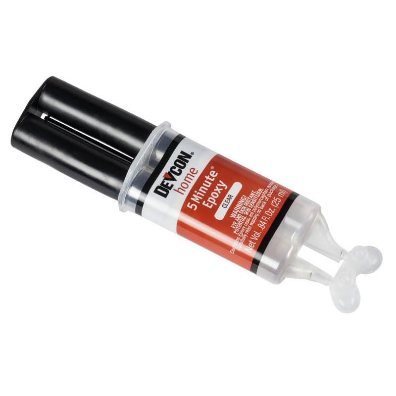 Product DescriptionDevcon 5 Minute Epoxy is a two part, rapid curing, clear, general purpose epoxy. Better on rigid materials, this epoxy is useful for repairing cars, bikes, boats, golf clubs, skis and more. May also be used as a metal filler and to restore rotten wood. Only mix the amount of resin and hardener together that can be used within the handling time, and always mix equal portions of resin and hardener thoroughly together in order for the product to cure properly. You can add color pigment concentrate to epoxy after it has been thoroughly mixed. Bonds metal, wood, glass, ceramic, concrete, stone, china, plastic, and fiberglass with a tensile strength of 1,500 PSI.From the ManufacturerA quick drying epoxy glue that will not drip or sag. Ideal to use on vertical surfaces. Use to fill voids and cracks in metal, wood and concrete.