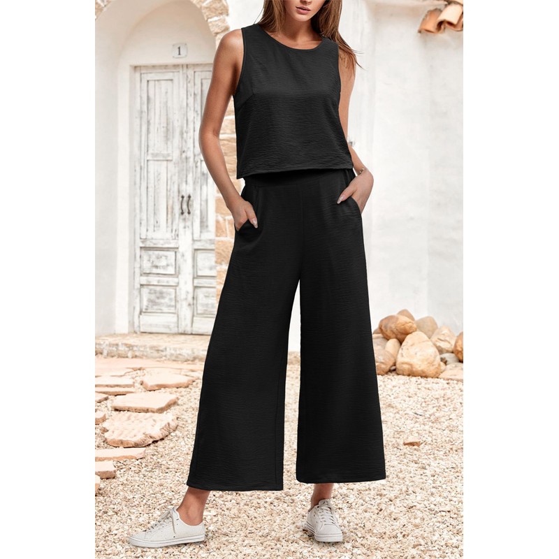 IWOLLENCE Women's Summer 2 Piece Outfits Set Round neck Sleeveless Tank Crop Top Wide Leg pants Set Pockets Jumpsuits Black Large