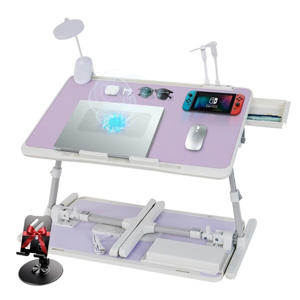 iXTRA Laptop Lap Desk Include Cooling Fan,Adjustable Lap Desk with Light Fan,Folding Laptop Desk for Bed with USB,Bed Desk with Storage Drawer 60x40cm,Purple