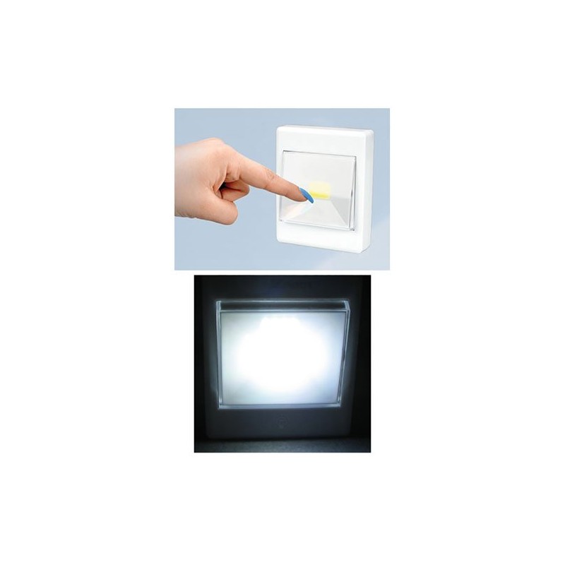 - Fixture measures 3" x 4" x 13/16" in white plastic with a big rocker switch that activates the 1” white COB LED in its center.