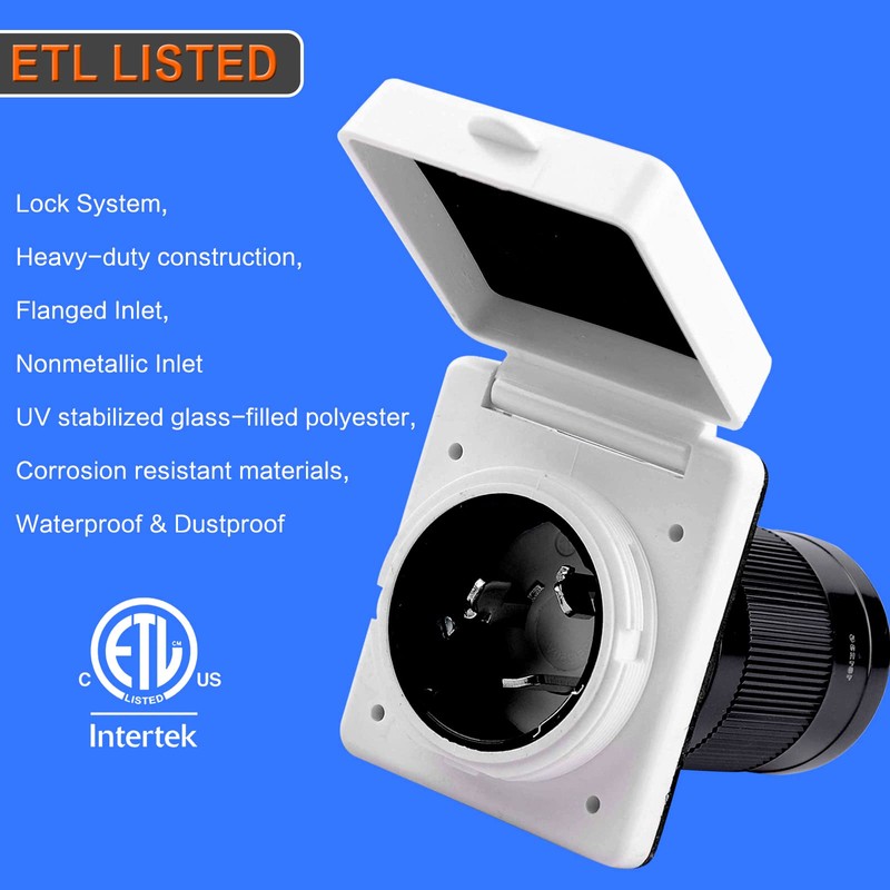 • ETL-Rated:50 Amp 125/250 Volt shore power inlet,NEMA SS2-50P,3 Poles,4 Wires,ETL Approved,Flanged Inlet,Flanged Inlet,safe to use;Heavy-duty construction,Flanged Inlet,Nonmetallic Inlet