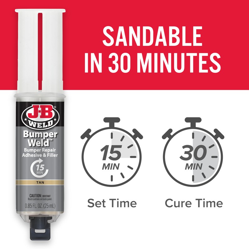 - J-B Weld BumperWeld is a two-part adhesive that provides strong repairs to automotive bumpers. BumperWeld dispenses in a 1:1 mix ratio, sets in 15 minutes, and can be sanded and painted in 30 minutes. BumperWeld can bond, fill gaps, and seal cracks. Once cured, BumperWeld has a strength of 3770 PSI, and a 35% elongation.