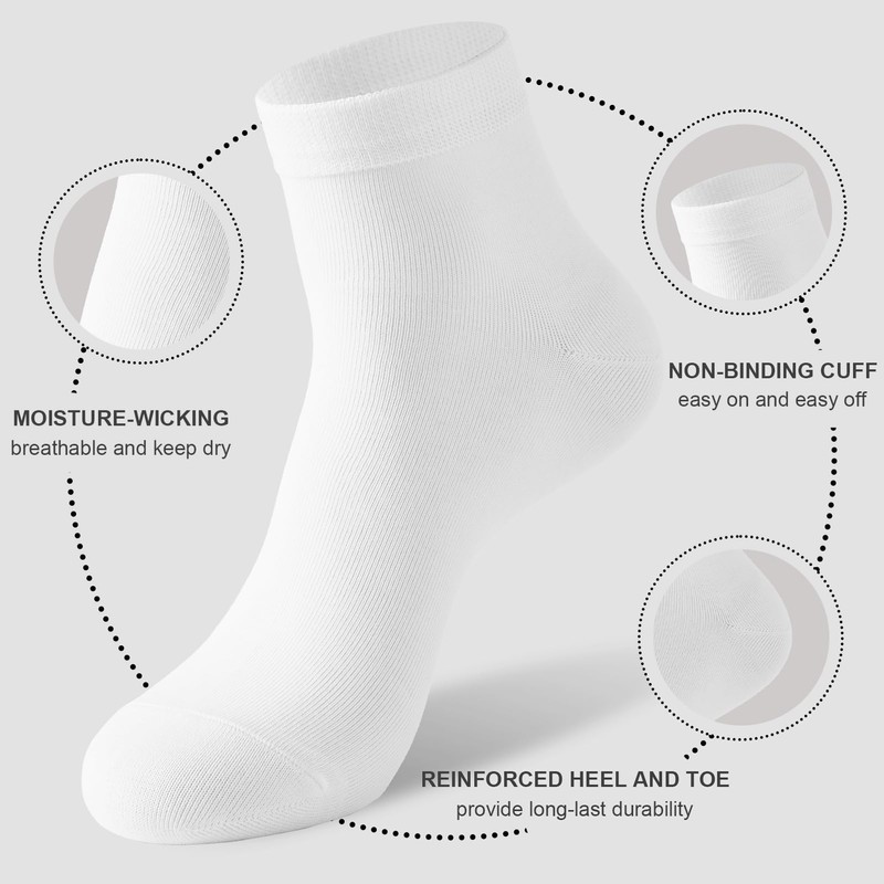 - 【High Cotton Content】The reason we choose to use more than 95% cotton content is because pure cotton socks have a standard moisture regain rate of 11.1%, making their sweat-absorption capability twice as effective as ordinary cotton socks and 26.5 times more effective than polyester fiber socks. By utilizing a higher cotton content, we ensure that the soles of your feet stay exceptionally dry, minimizing the chance of foot odor to the greatest extent, providing you with enduring comfort.