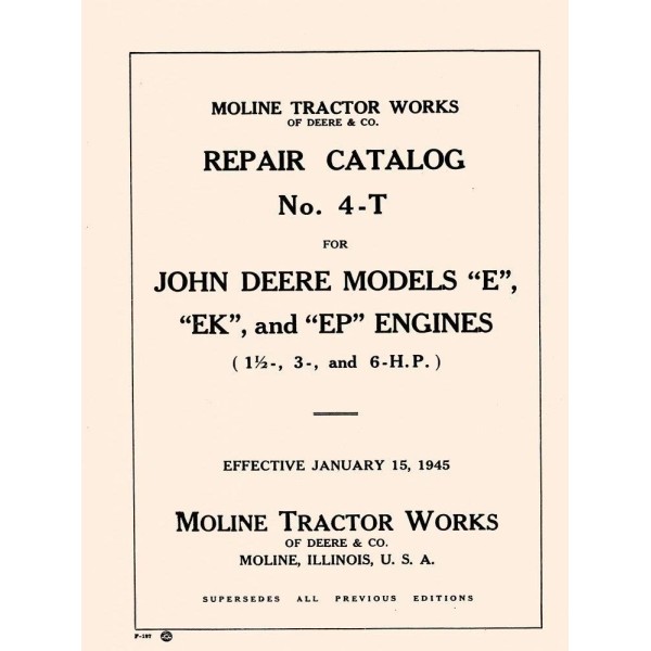 John Deere Models E, EK & EP Engine 1 1/2, 3, and 6 H.P. Repair Catalog Manual