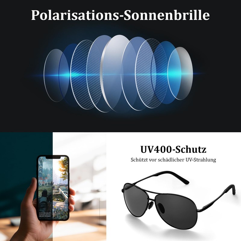 - High-quality material: these aviator glasses men are equipped with a lightweight metal frame that does not strain on the nose even during prolonged wear. The lenses of the men's polarised sunglasses are made of TAC material, the lenses are polarised, which effectively reduces glare and stray light and makes your vision clearer.