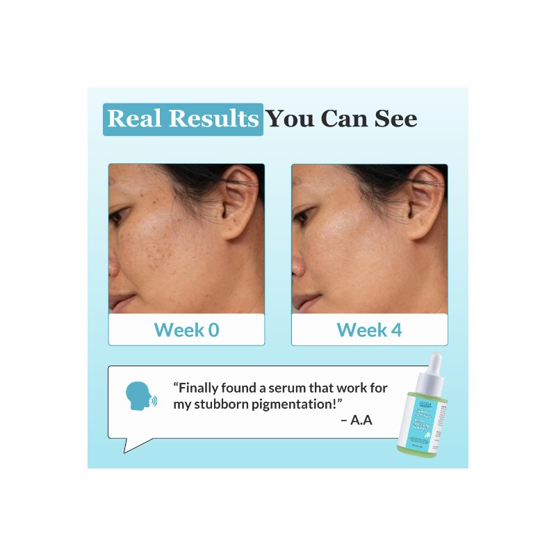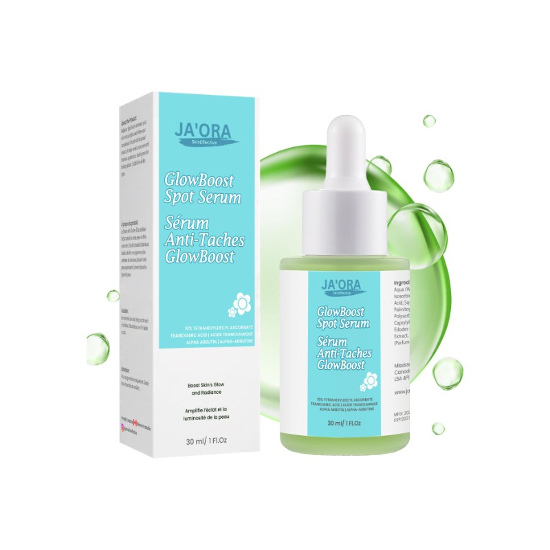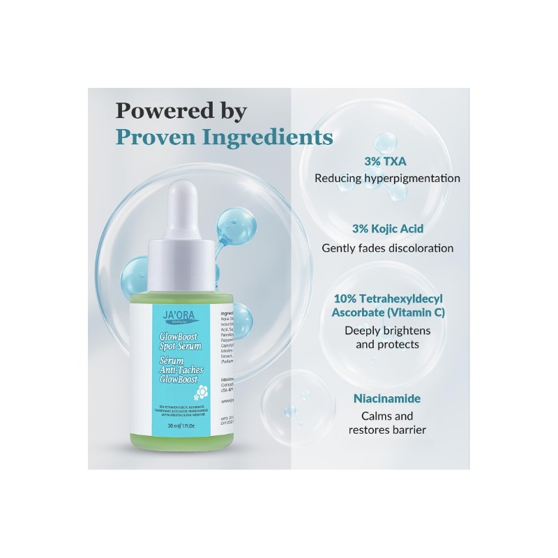 Unleash a more even-looking glow with JA’ORA GlowBoost Spot Serum—an advanced formula designed to visibly improve the look of uneven tone, dark patches, and post-blemish marks, all while remaining gentle on skin Featuring a clinically proven brightening trio—Tetrahexyldecyl Ascorbate , Tranexamic Acid, and Kojic Acid—GlowBoost helps fade dark spots, even out tone, and restore glow from deep within. Infused with Matrixyl (Palmitoyl Pentapeptide-4) to help refine skin texture and promote a youthful appearance, complemented by deeply nourishing ingredients like Squalane, Beta-Glucan, Sodium Hyaluronate, Shiitake Extract, and Chlorophyll for balanced hydration and skin comfort. Fast-absorbing, non-sticky, and non-comedogenic, GlowBoost is gentle yet transformative—suitable for all skin tones and especially melanin-rich, blemish-prone, or sensitive skin.