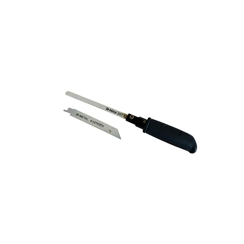 This interchangeable set contains two different blades, a 6.5" TPI for metal cutting and a 12" bi-metal hacksaw blade. It can serve many purposes with its strong coat, including metal and wood trimming or cutting. The handle is cushioned with an adjustable and non-slip grip for a firmer and safer hold. This will also accept any standard and reciprocating blades.