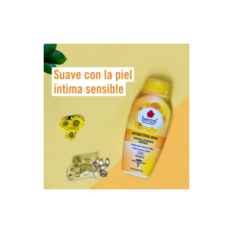 Jabón líquido Íntimo Benzal Wash Manzanilla, especialmente formulado para fortalecer las defensas naturales del área íntima. Con infusión de manzanilla, un poderoso antibacterial natural, brinda protección contra posibles infecciones ginecológicas causadas por hongos.
