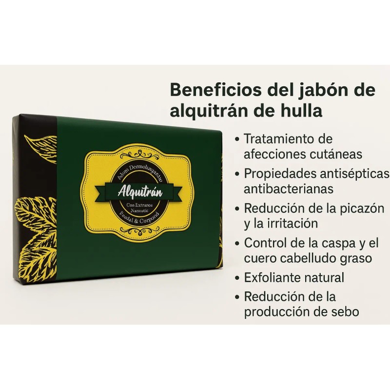 Descripción Limpia: El Jabón Natural Alquitrán Hulla de Sands Care es la solución perfecta para cuidar tu piel de manera natural. Con su fórmula orgánica y libre de alcohol, este jabón es ideal para todo tipo de piel, incluso la de los bebés. Su componente destacado, el alquitrán de hulla, ofrece múltiples beneficios como eliminar la caspa, la psoriasis y la dermatitis saborreica , además de combatir infecciones y eliminar la grasa.