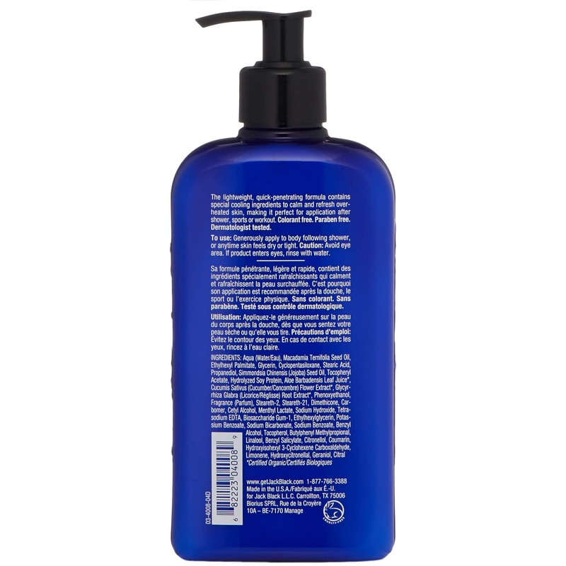 Jack Black Cool Moisture Body Lotion works fast to provide relief and enhance comfort. Every Jack Black product is dermatologist tested, paraben free, cruelty free, and free of harsh surfactants. Almost all of the products in our line are vegan, free of artificial colorants, safe for sensitive skin, and made in the USA. If you have been searching for a fast-acting, quick- penetrating lotion that will cool, soothe, and hydrate your skin, add Jack Black Moisture Body Lotion to your daily regimen.
