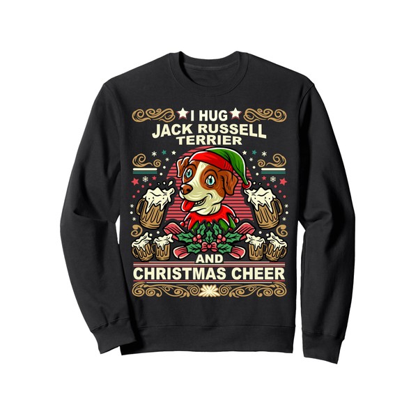 - Jack Russell Terrier Christmas Cheer Santa Claus Dog design shows cute dogs as Santa Claus, elf, reindeer in front of a christmas tree with lights, ornaments, candles, candy cane and x-mas lighting. Feliz Navidog, Happy Howlydays, Merry Woofmas.