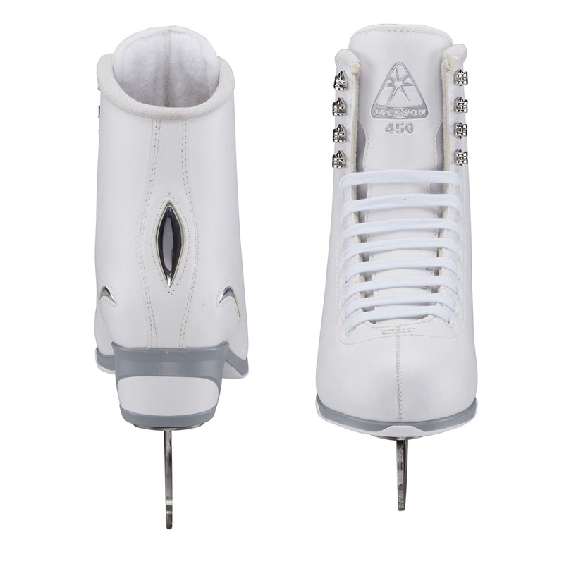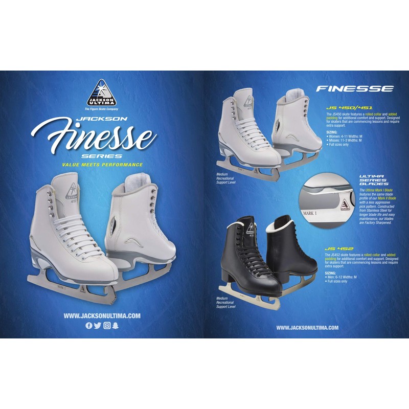 Jackson Ultima Figure Ice Skates FINESSE - Bundle JS450 Bundled with Jackson Oversized Bag JL350 and Guardog Skate Guards ATTENTION: SIZING CHART IS ATTACHED AS THE SECOND IMAGE. YOU MUST REVIEW IT BEFORE THE PURCHASE PRODUCT FEATURES: Traditional upper patterns with stylized chrome inserts.; Reinforced vinyl coated uppers give strength, support, and durability.; Rolled padded lining with extra ankle foam for a soft comfortable feel with no irritation.; Padded felt tongues for comfort and support; New fashionable no maintenance PVC outsoles.; New Ultima Mark I stainless steel blade allows for use in learning to skate programs