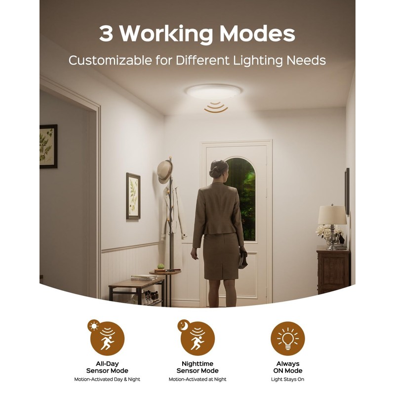 - 【3 Modes Of Motion Sensor】Our wireless ceiling light has 3 modes (day/night motion sensor activated mode,constant light mode).In DAY mode,the light detects motion all day .In NIGHT mode,the sensor will only activate in dim conditions.Always On mode,the light can be kept on all the time as a normal ceiling lamp.