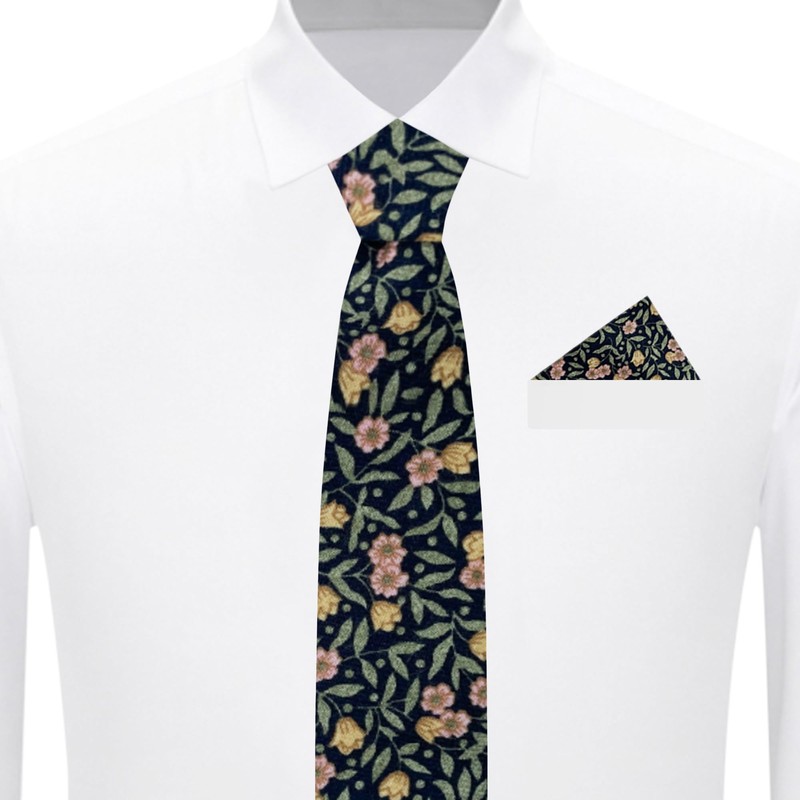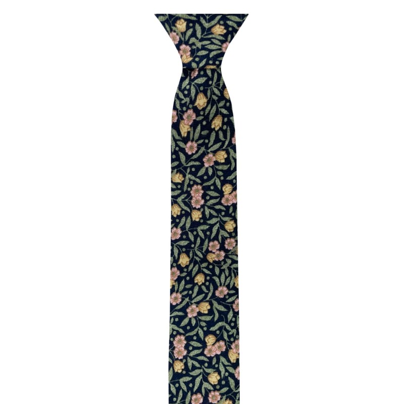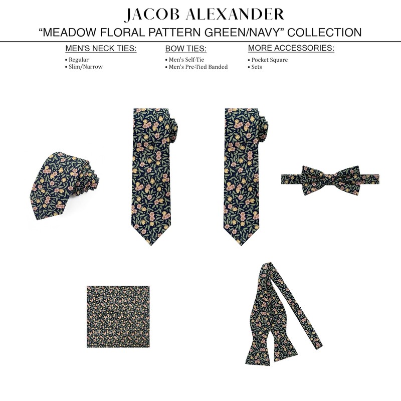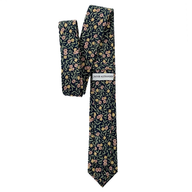 From brand Jacob Alexander, is this green/navy meadow floral pattern men's slim width self-tie classic length size necktie made with 100% cotton. The tie measures a standard 58 inches (147 cm) long and a narrow 2.5 inches (6.5 cm) wide.