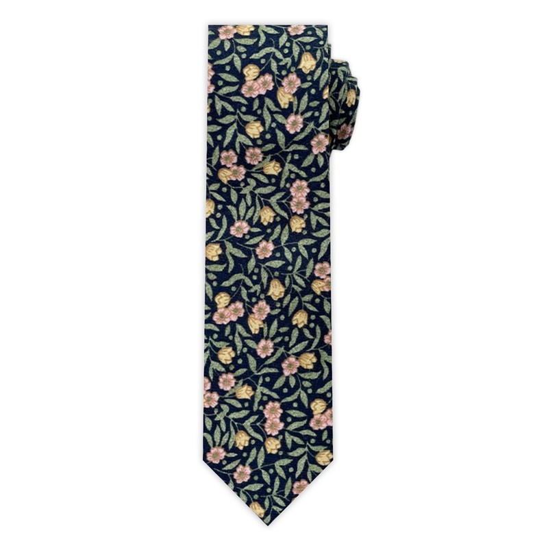 • Men's slim width self-tie neck tie in green/navy meadow floral pattern.
