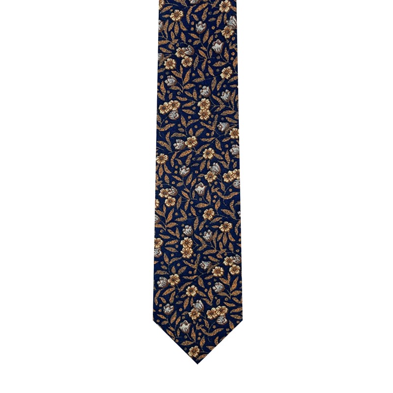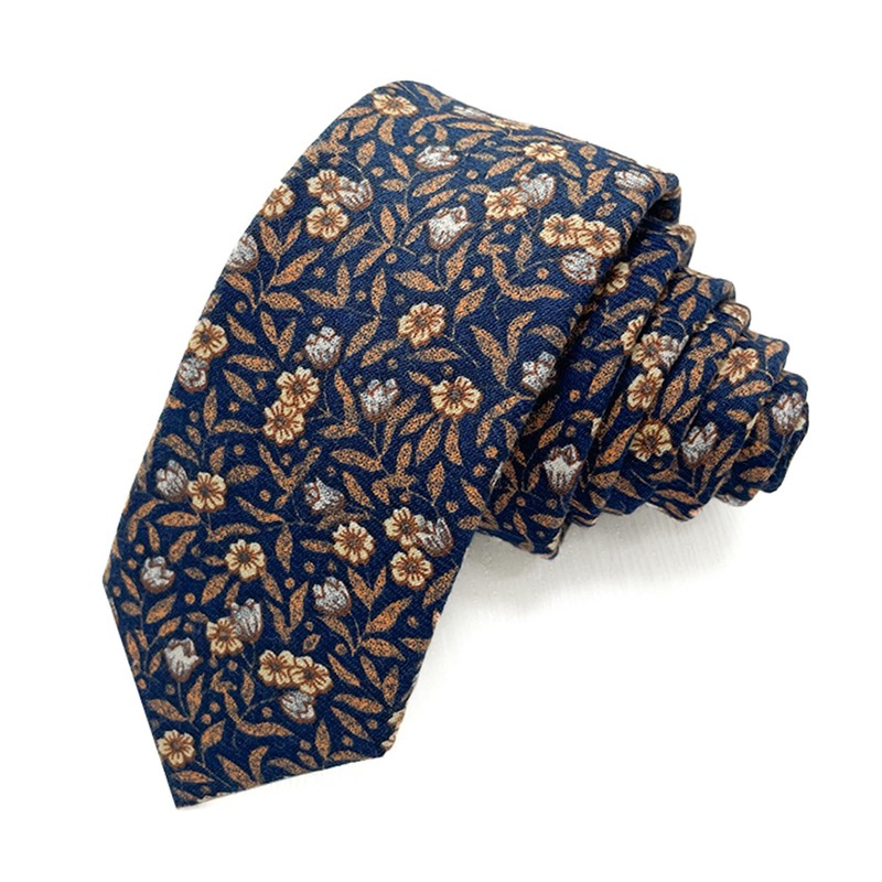- Men's slim width self-tie neck tie in rust/navy meadow floral pattern.