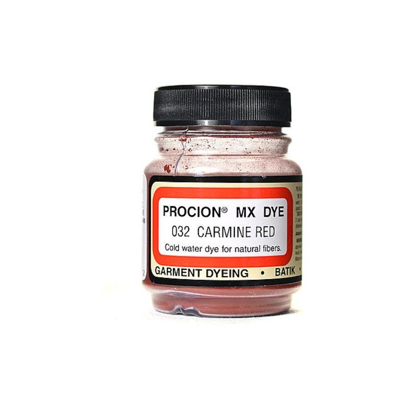 Jacquard Procion MX Fiber Reactive Dye- Color: carmine red- Color code: 032- Size: 2/3 oz.Permanent, colorfast, and very washable.You can easily create a palette of brilliant colors ranging from light pastels to deep, vibrant huesPerfect for all natural fibers--cotton, rayon, linen, silk, wool, paper, reeds, and woodThese will not dye syntheticsUse for tie-dye, vat dyeing, batik, airbrush, hand painting, printing, spatter-painting, and moreThis concentrated dye, which you add to tap water, gives you brilliant color2/3 oz. jarsGenerally, use 1 tbsp. of dye per 1 pound of fabric (three to six square yards or three T-shirts)Keep dyes in a closed container in a cool, dry place and they will remain usable for several yearsThese chemicals used in the dyeing process are sold separately: Soda Ash Dye Fixer Urea , a humectant Sodium Alginate , a thickener Synthrapol , a mild soap Warehouse group number: 1373