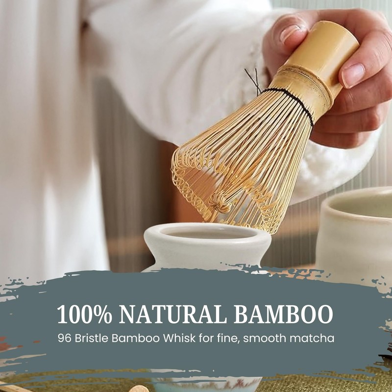 - Natural Bamboo Whisk with 96 Bristles – Our 100% bamboo matcha whisk features 96 prongs, designed to create a perfectly frothy, smooth matcha tea. Essential for any matcha kit or matcha tea set.