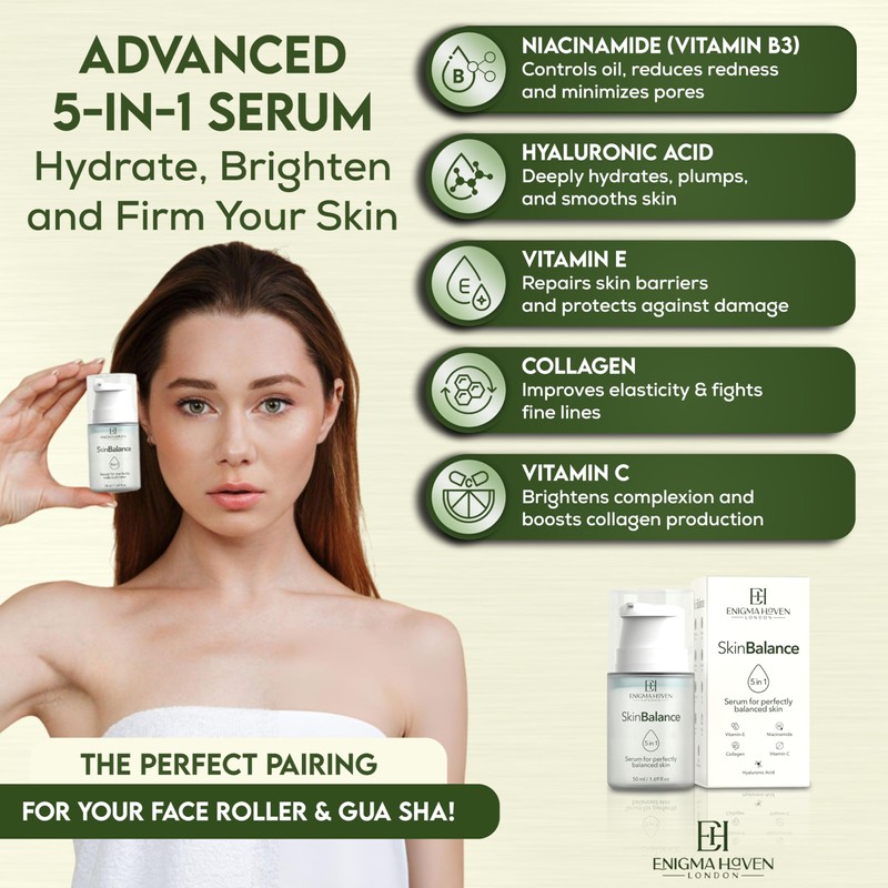 - 💎 5-in-1 Skin Balance Serum: Clinically backed ingredients hydrate, brighten, and support collagen for firmer, smoother skin.