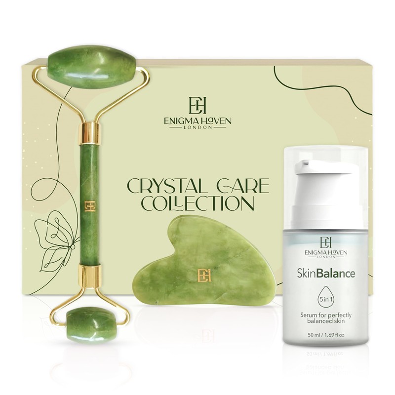 Jade Roller & Gua Sha Set Premium with Skin Balance Serum – 100% Natural Jade Tools + Hyaluronic Acid, Vitamin C, Niacinamide – Anti-Aging, Glowing Skin Gift Set for Women (Green Jade)