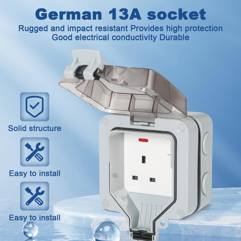 - 4.【Application Scenarios】: Outdoor plug socket is suitable for indoor kitchens, laundry rooms, bathrooms, and basements. Also suitable for outdoor laundry rooms, workshops, garages, gardens, swimming pools, and commercial applications.