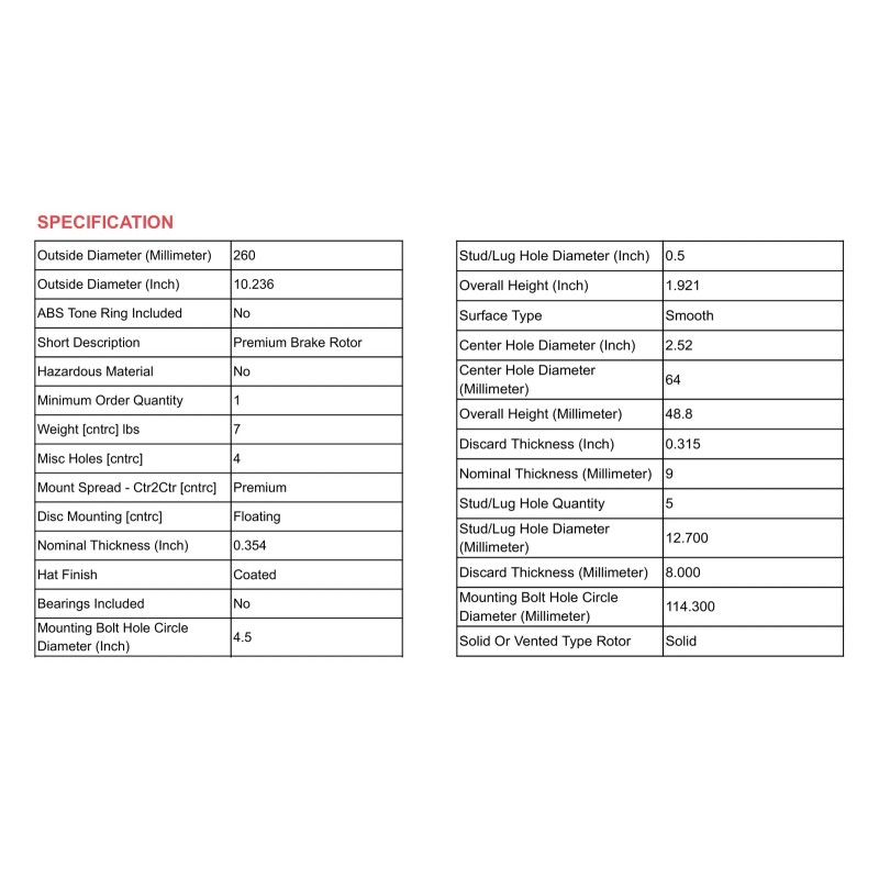 • Rotor Outside Diameter: 10.236in(260mm)