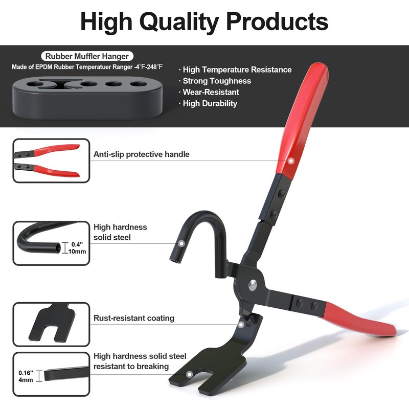 - Quality: Exhaust rubber hanger removal pliers are made of high carbon steel. It is corrosion resistant and can withstand the rigors of automotive repair tasks. You can rely on it for long term use