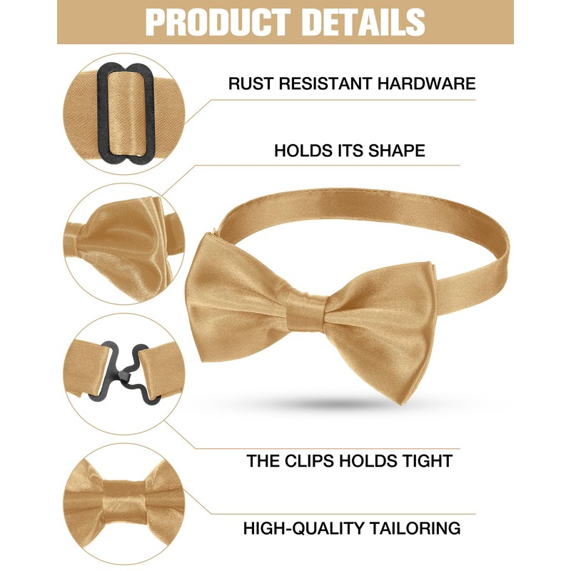 - Thoughtful Design: our champagne bow tie comes pre tied in a neat bow, no need to search for tutorials to learn how to tie it, good time saver; It also features an adjustable collar for your comfort and customization of wearing