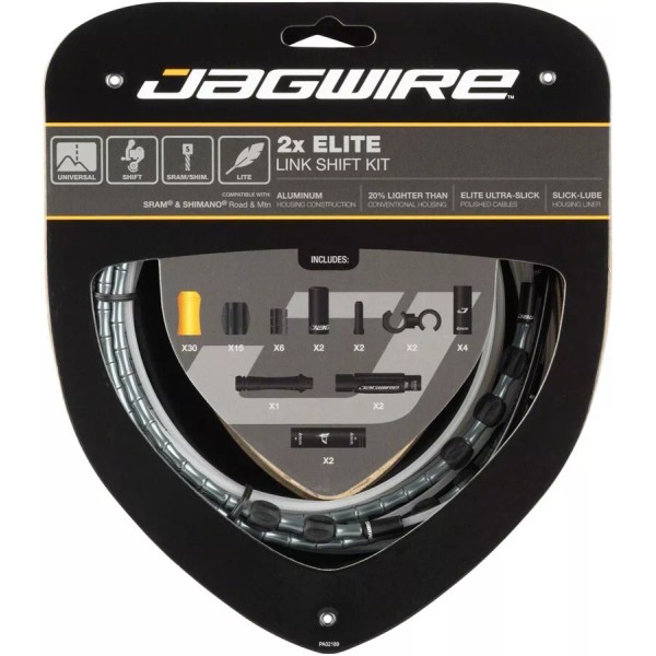Jagwire 2x Elite Link housing and shift cable set is the ultimate combination of durability and attention grabbing looks. Lightweight and flexible, its compressionless design and along with the included ultra-slick polished inner cables delivers precise shifting performance. Each kit comes with links pre-installed on housing segments for quick and easy setup.
