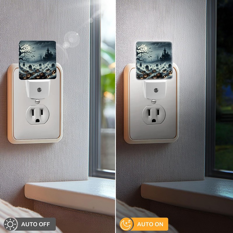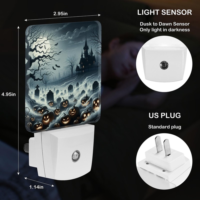 Jahiona LED Night Light Lamp with Smart Sensor Dusk to Dawn Sensor,Halloween Pumpkin Lantern Graveyard Tombstone Gnarled Tree Castle Cloudy Sky Moon Bats Night Light Daylight White,0.5W Plug-into Wall