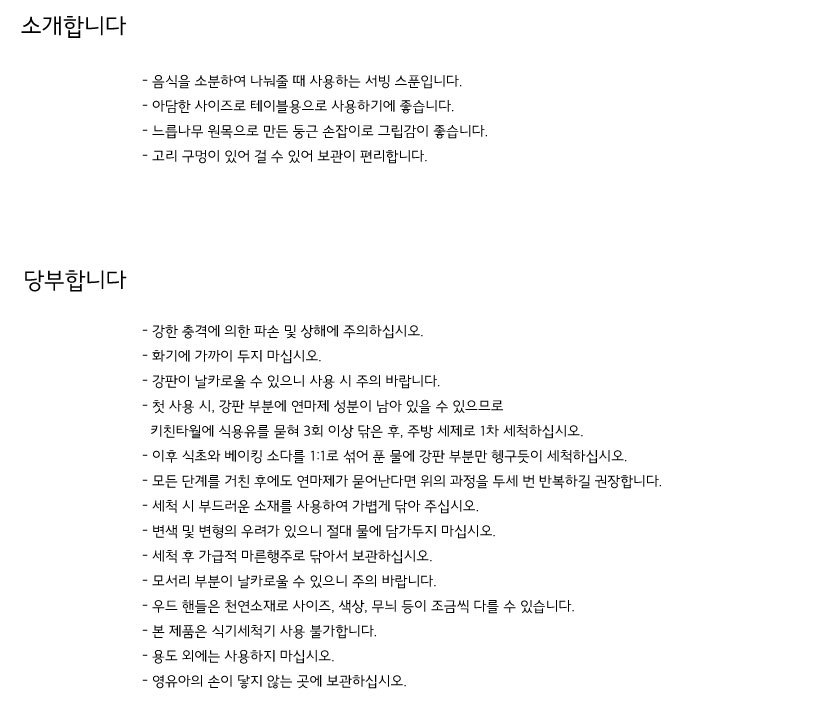 Product name and model name Wormwood handle serving spoon_24CM Release date and month of the same model None KC certification required or not None texture Metal (stainless steel), wood (elm) size Total length 24CM, spoon 13CM (earth 1CM) Components Wormwood handle serving spoon_24CM Country of manufacture korea Import status Y,N / Importer, import declaration according to the Food Sanitation Act: N manufacturer There Icheon Co., Ltd. Quality assurance standards This product can be exchanged or compensated for in accordance with the Consumer Dispute Resolution Standards notified by the Fair Trade Commission. A/S manager and phone number (Inpix Customer Center 02-336-9256)