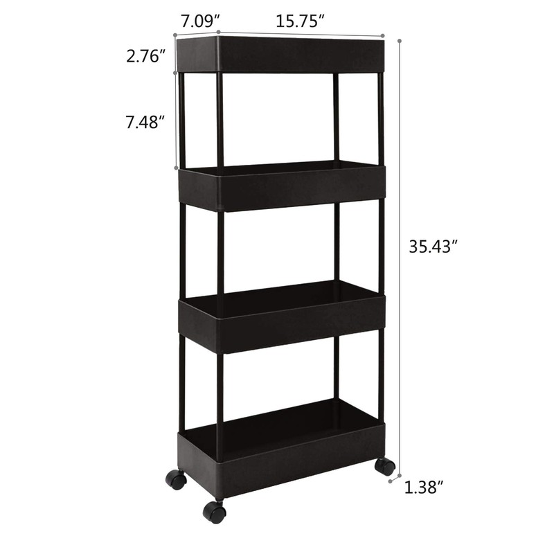 - Cart’s Dimensions: 15.75”x7.09”x35.43”, the slim shape makes it fit for many narrow spaces. The clearance between each basket is 7.48 inch, plus the height of the basket 2.76 inch, very suitable for storing tall items.