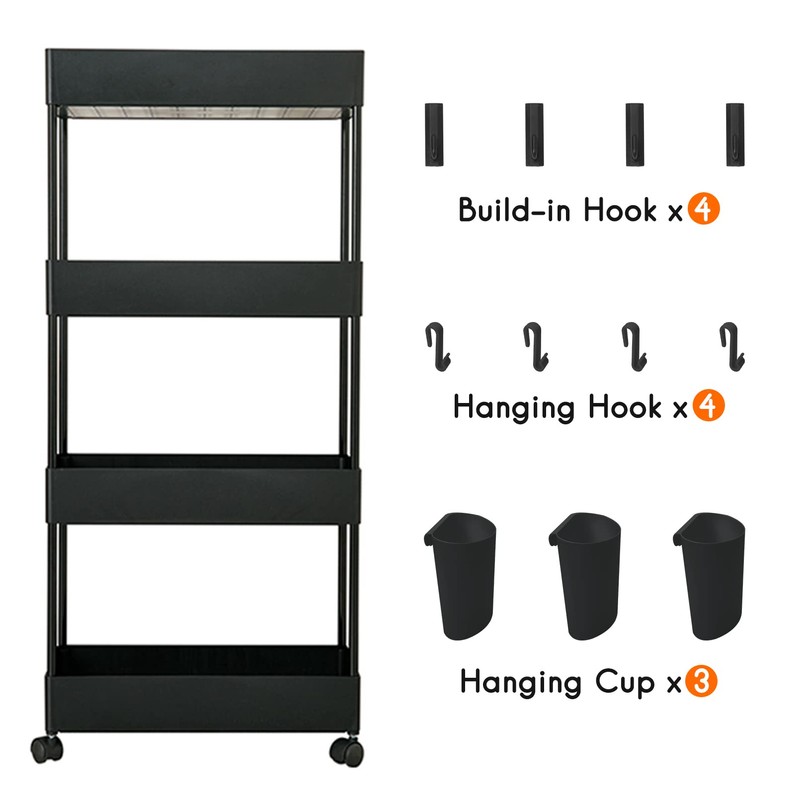 JAKAGO 4-Tier Utility Rolling Storage Cart Slim Mobile Shelves on Wheels Multi-Function Trolley with Mesh Basket Storage Organizer Rack for Kitchen Pantry Bathroom Laundry (Black)