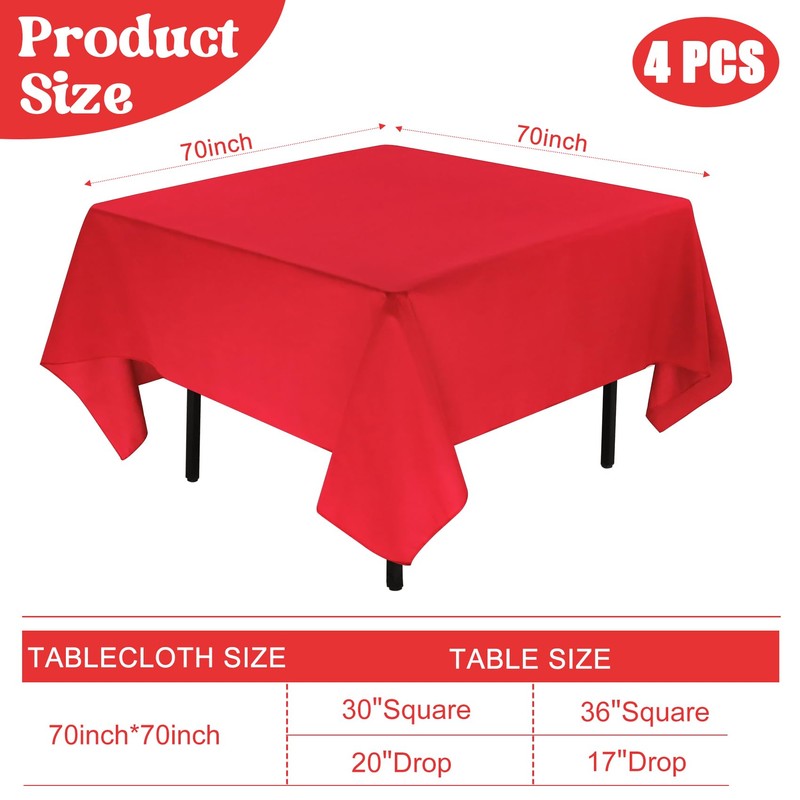 - 【PACKAGE INCLUDED】The package will include 4 packs of red 100% premium polyester tablecloths. This size of each tablecloth is approximately 70” wide x70” long, Various square shaped table cloth fits square or round folding tables. Please carefully measure your table size before purchasing our tablecloth, Thank you so much!