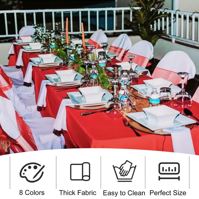- 【PREMIUM POLYESTER FABRIC】The polyester table covers are made of 100% polyester fabric. It can be used repeatedly. These materials are as skin-friendly as they are environmentally friendly. Perfect to protect and decorate your tables. The tablecloth has an elegant look with neat seams and excellent hemmed edges, which will provide a low-key sense of luxury for your table.