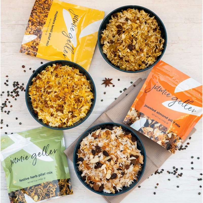 Jamie Geller Seasonings Bag Sampler, 5 Pack: Mujadara Lentil Pilaf Mix, 5 oz (142g), Festive Herb Pilaf Mix, 5 oz (142g), Jeweled Almond Pilaf Mix, 5 oz (142g), Shakshuka Seasoning Mix, 5 oz (142g), and Crispy Onion Medley, 3.3 oz bag (93g) | OU KOSHER P
