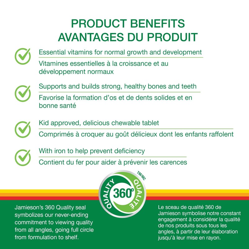 - ESSENTIAL NUTRIENTS FOR GROWING BODIES: Kids grow quickly! To nourish their growing bodies, Jamieson's Multivitamin for Kids is specifically designed to promote healthy growth and development.