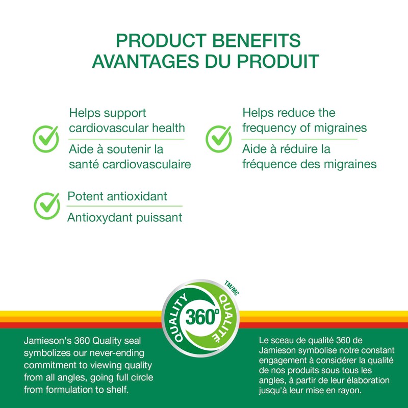 Jamieson CoQ10 250 mg formula is a high potency antioxidant ideal for maintaining general health and supporting a healthy cardiovascular system. In addition to antioxidant and energy support, higher-dose CoQ10 helps reduce the frequency of migraine headaches and associated nausea and vomiting.