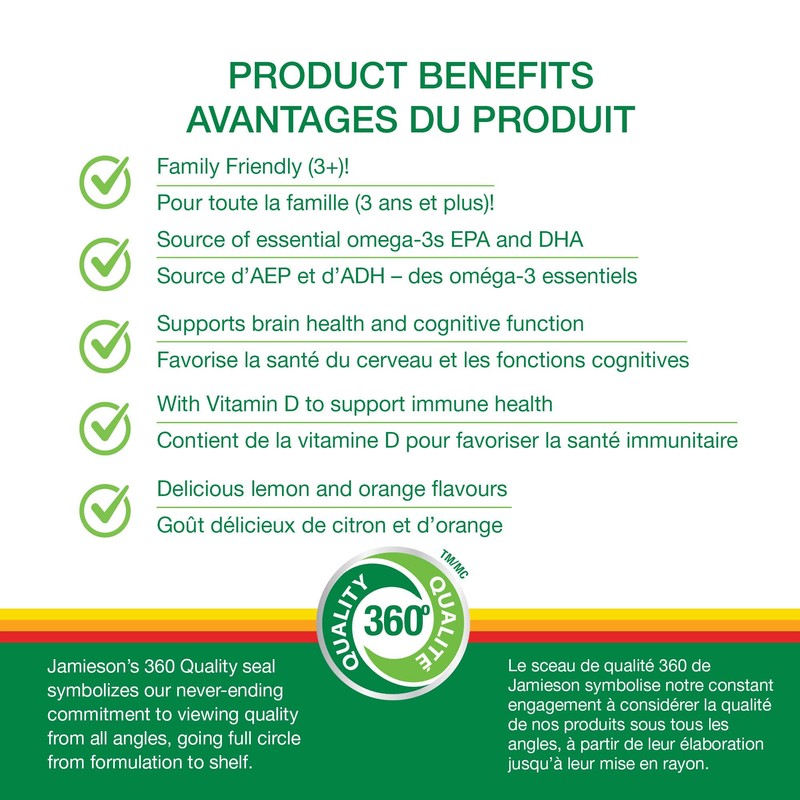 Jamieson Omega-3 Gummies are a family-friendly formula providing premium EPA and DHA plus Vitamin D3 in all-natural orange, lemon & mixed berry flavor gummies. The family-friendly formula is for adults, adolescents, and children 3 years and older. Jamieson Omega-3 Gummies are free from artificial flavors, colors, or preservatives.