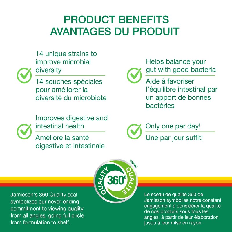 Jamieson 10 Billion Probiotic Daily provides complete digestive support in an easy-to-swallow tablet.