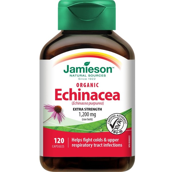 Jamieson Echinacea 1,200 mg is a high potency, organic formula of pure Echinacea purpurea. Echinacea has been used traditionally in herbal medicine to fight off upper respiratory tract infections, relieve cold symptoms, and shorten the duration of colds and flu.