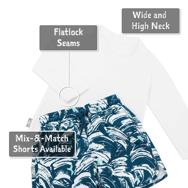 Designed with toddlers in mind, the swim shirts have high and wide neck opening that makes it easy to put on and take off. There isn't any annoying labels inside our clothing.