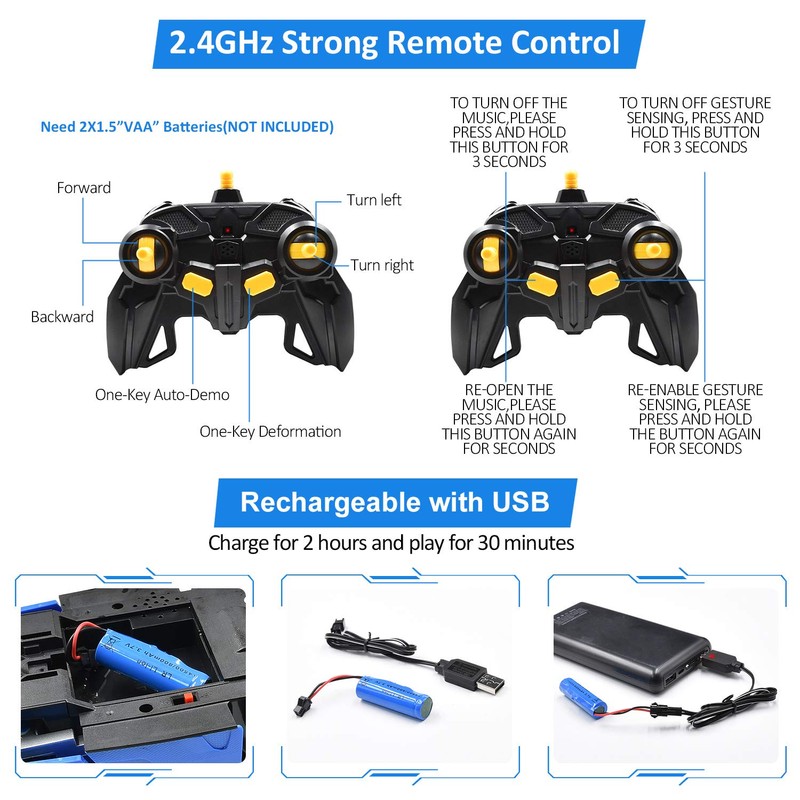 - 【Two Kinds of Playing】Remote Control Robot can transform automatically from car to robot when you press the button on the controller or with your hands to sense. Just press the demo button and accompany the exciting music, it will show you a wonderful performance. Most amazing thing is that it has 5 smooth wheels and could finish 360° turning flexibly in both robot model and car shape.Let your child have a robot and a car at the same time. Transforms back and forth easily and quite awesome.