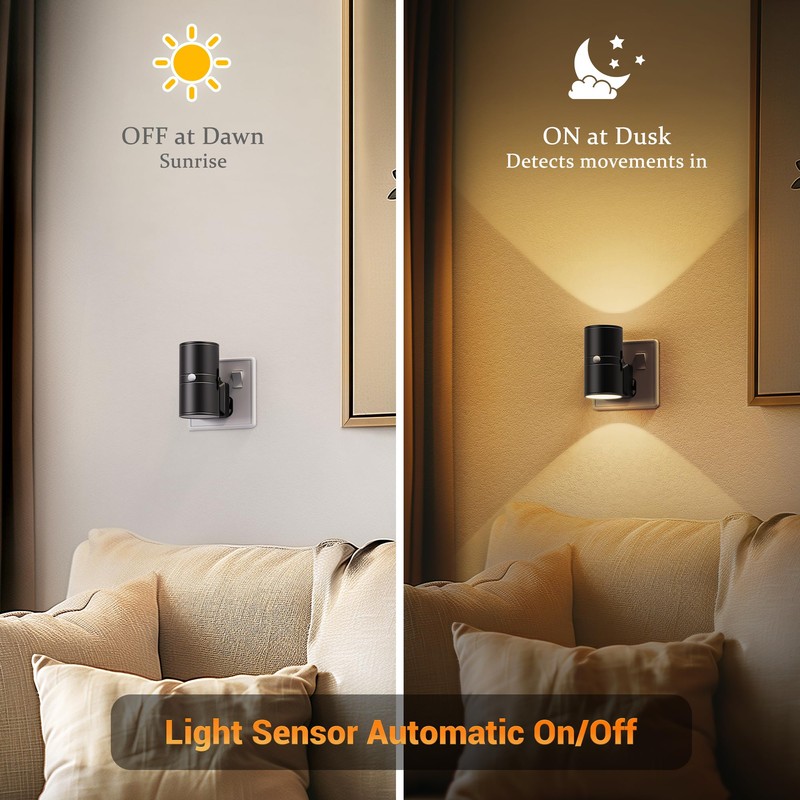 - 3 Lighting Modes: The plug in night light has a built-in motion sensor with 3 lighting modes. "On" mode - always on at night; "Off" mode - turns off the light; "Auto" mode - automatically turns on when motion is detected in the dark (Sensing Range: 3-5M, 120) and turns off after 60 seconds of inactivity