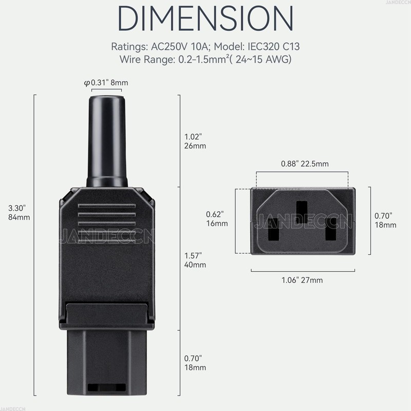 • Ratings: AC250V 10A; Model: IEC320 C13