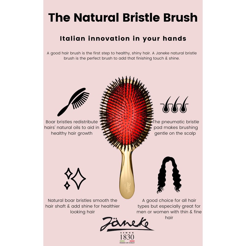 This oversized paddle hairbrush is ideal for polishing the hair. Its soft, natural bristles add shine while smoothing out the hair shaft. Bristles rest on a pneumatic cushioned pillow. The brush is made in Italy and measures 9.25" in length and 3.4" in width. Available in polished Chrome or Gold. Excellent for all hair types, especially fine Natural boar bristles promote healthy hair by redistributing hair's natural oils Soft bristles smooth the hair shaft leaving hair shiny and less brittle Pneumatic pad makes brushing gentle for scalp Made in Italy