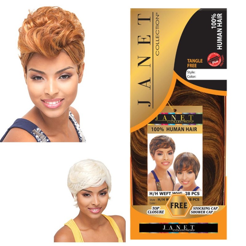 WEFT WVG 28 PCS Length matters. Janet Collection feel that you deserve more from your 28 pieces. Janet Collection's 28 Pieces come in lengths of 3"/4"/5" unlike competitiors 1"/2"/3" lengths. Longer pieces allow more variations in style, e.g. flip-in and flip-vout, as opposed to being restricted to just a bob style. More value and flexibility for your money spent on 28 pieces. More ways to look beautiful. · 28 Piece Weaving Hair · 100% Human Hair · Free Top Closure, Stocking Cap & Shower Cap · SINGLE Pack Ordering