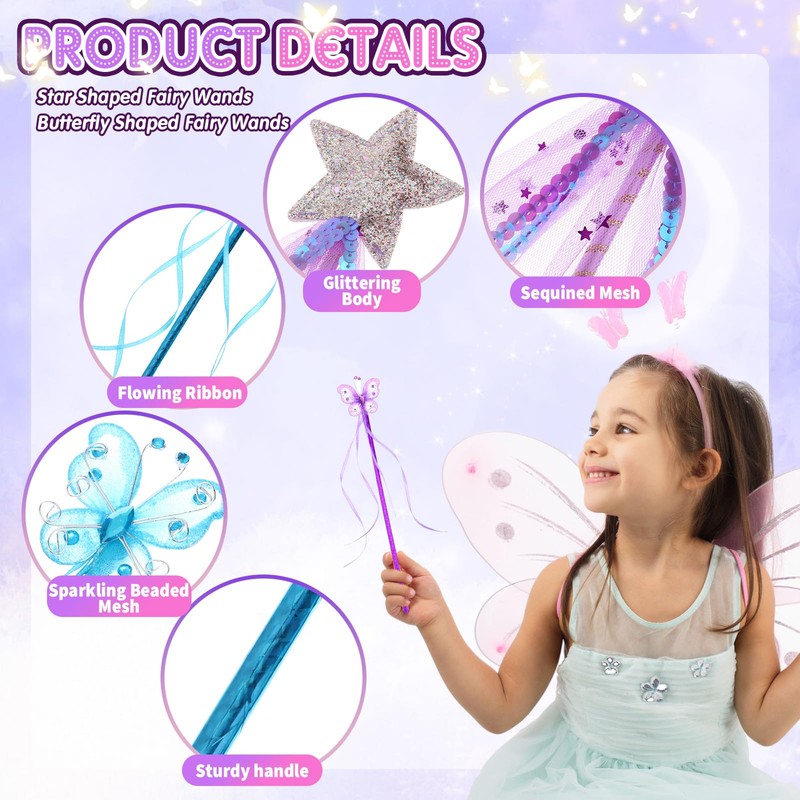 - Princess Set: it includes 12 star shaped fairy wands and 12 butterfly shaped fairy wands, both of which are in 4 bright colors, pink, purple, gold, blue, 3 pieces for each color; Sufficient quantity and diverse colors to meet your various decoration, replacement and sharing needs, cute and delicate accessories are enough to make your princess dream come true